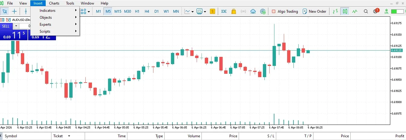 1. Open the MT5 platform and select the chart of the instrument you want to analyze.