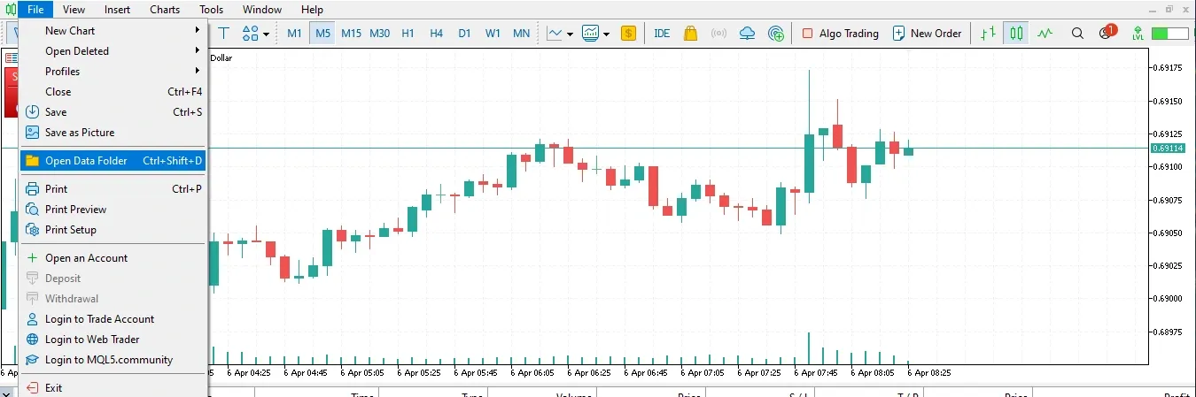 2. Open MT5 and click on File → Open Data Folder.