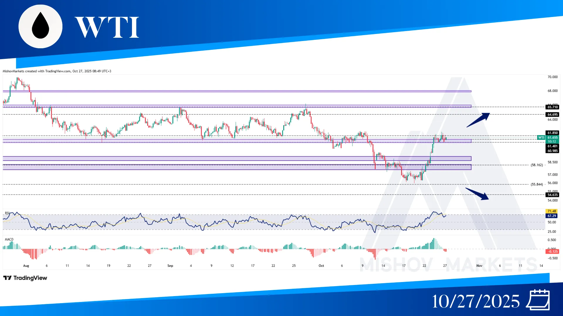 در نفت وست تگزاس WTI، کاملا مطابق با تحلیل روز چهارشنبه، قیمت به مسیر صعودی خود ادامه داد و به سمت اهداف 59.280 و 60.980-61.400 حرکت کرد. اکنون در صورت شکل گیری کلوز معتبر بالای سطح 62.500، میتواند به سمت اهداف بالاتر نظیر 64.690، 65.710، 67.790-67.980 و حتی 69.100 برود. اما اگر سطح 61.850-62.000 به عنوان مقاومت عمل کند، قیمت میتواند کاهش بیشتری به سمت اهداف 59.200-58.800، 58.100-57.700، 55.840 ، 54.635 و 52.020 داشته باشد.